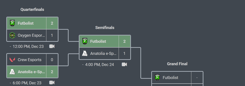 Teams that qualified for the semifinals by winning the quarterfinals were Futbolist, Anatolia e-Sports, Dark Passage, and Sangal Esports. All of the Elite Invitational semi-final matches were scheduled to be played today, but due to technical glitches, Dark Passage vs The Sangal Esports match postponed to tomorrow, the day of the grand final.