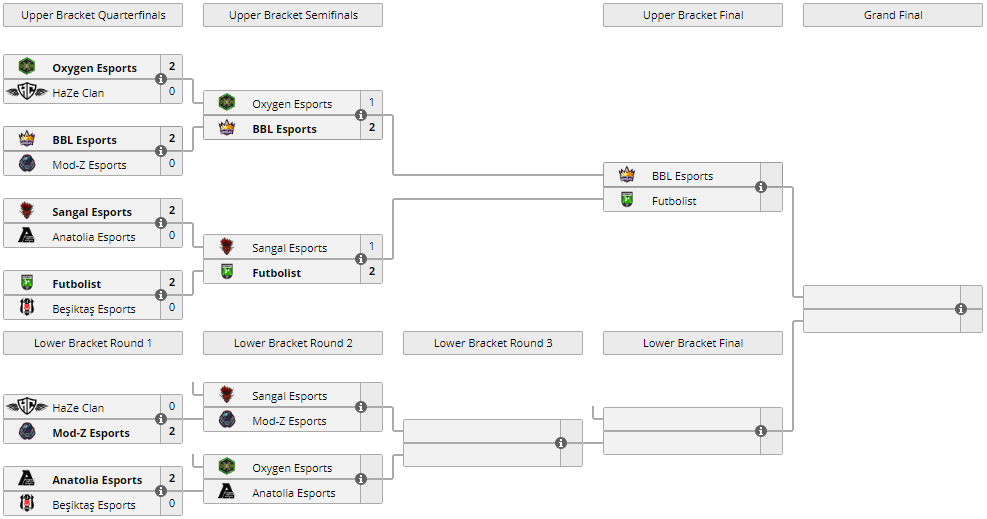 Today’s matches started at 13.00 (GMT+03). On the lower bracket match that the loser would be out of the game, Anatolia e-Sports and Beşiktaş Esports faced each other. Another match of the day was for the upper bracket finals. In this match, Sangal Esports faced Futbolist. Other matches of the day were “Mod-Z Esports vs. HaZe Clan” and “Oxygen Esports vs BBL Esports“.
