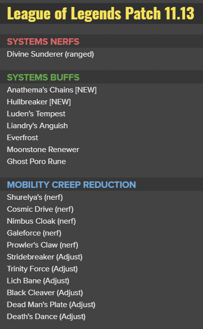 - Typhoon (ORNN’S UPGRADE) Mythic Passive Bonus Movement Speed 3%⇒ 2%