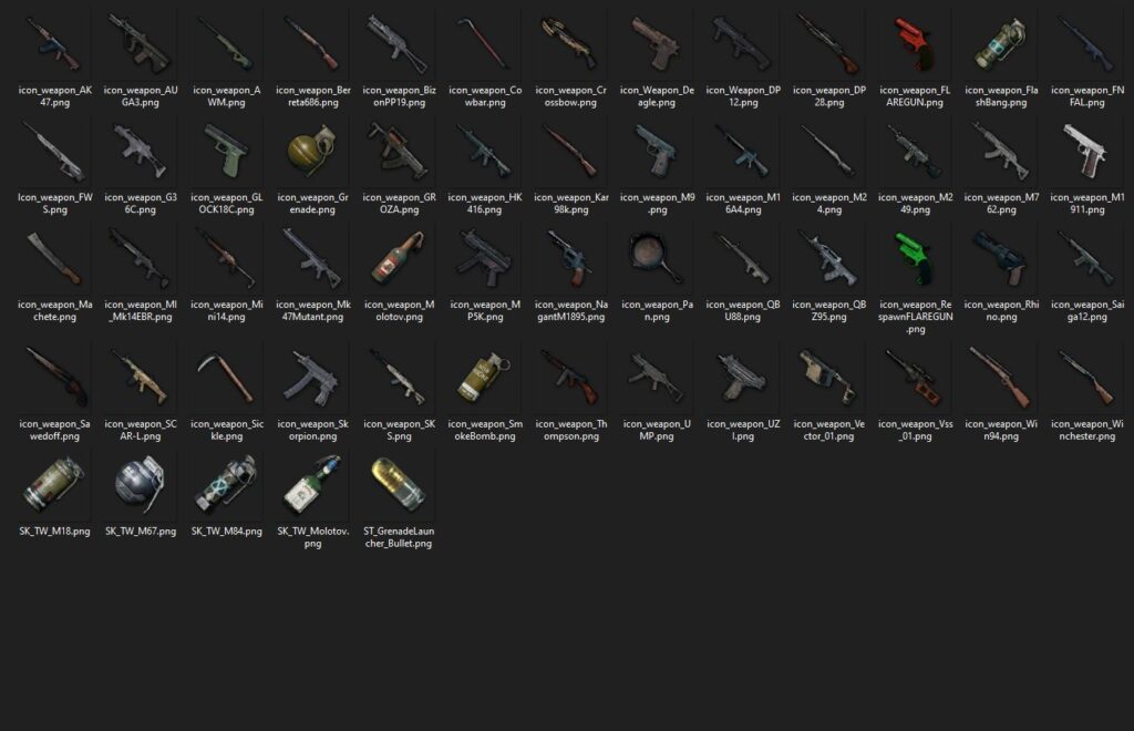 In this leak, the visual files of all the weapons that will be included in the game are in one image. We’ll take a look at the details, especially about the weapons we didn’t see during the testing phase. The first of these is FWS, a modern and futuristic version of AWM. Since our game is set in the future, having an alternative sniper rifle makes sense. Another striking image is the Grenade Launcher. As you know, grenade launchers are a weapon we are familiar with, especially from the Call of Duty series. It allows you to drop a bomb that deals medium damage at short and medium ranges with an attachment added from the bottom to Rifle type weapons. This weapon also seems to be the result of Krafton’s CoD “inspiration”. Finally, the SK_TW_M18.png image file appears as an example of a colored smoke bomb.