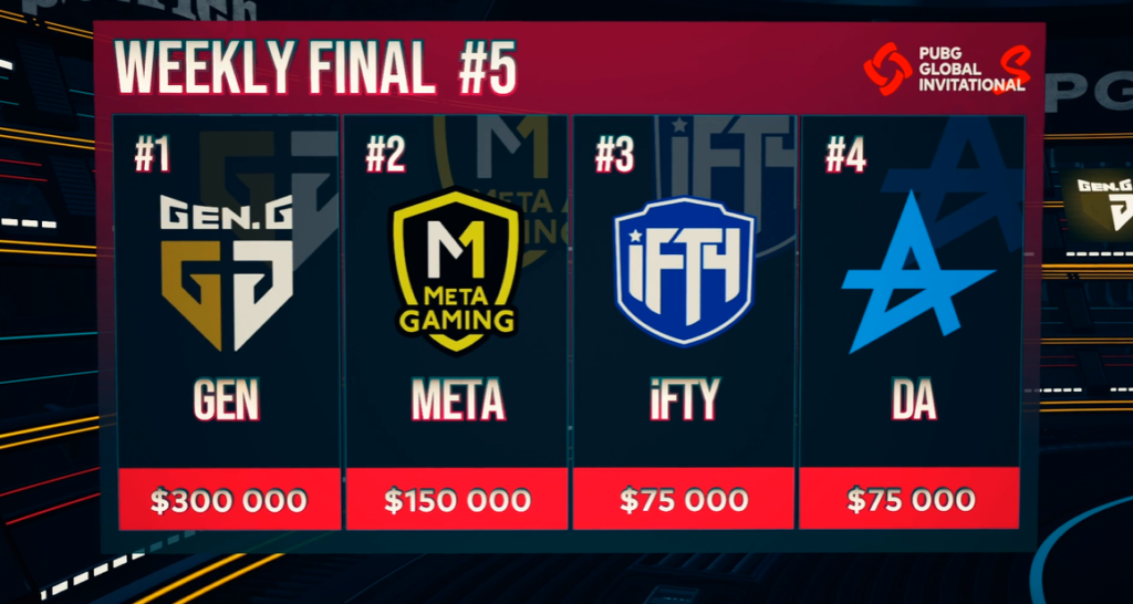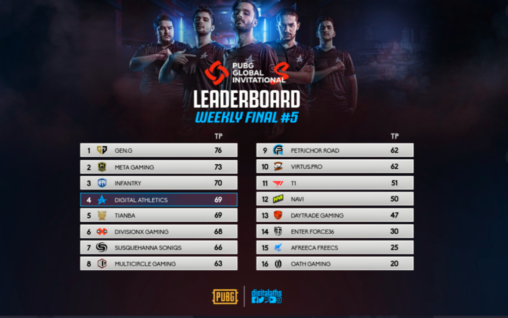 As a result of the games played, Gen.G (GEN) team finished first place with 76 points in the Weekly Final #5. Meta Gaming (META) ranked 2nd with 73 points, while Infantry (IFTY) ranked 3rd with 70 points. Turkish team Digital Athletics (DA), collected 69 points like Tianba (TIAN). There was an equality of points. In this case, the first points to look was the number of killings. However, it was seen that both teams received 41 kills. In this situation, the most points collected in a match were taken into consideration. Digital Athletics was ahead of Tianba with a 20-point victory in the last game. On the other hand, Tianba team collected 19 points with 9 kills in Match 7, thus Tianba finished in 5th place.