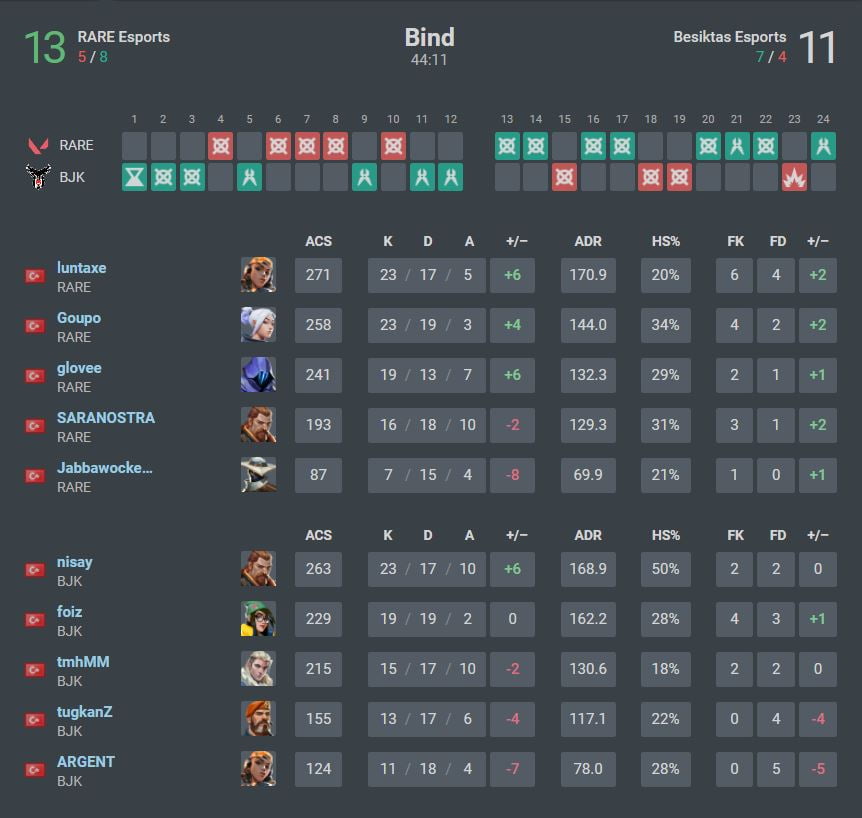 On the lower bracket, the match would determine the first team from Group C to be eliminated. RARE Esports and Beşiktaş Esports played the match in the Bind. The match went head-to-head but RARE managed to win the match by 13-11.