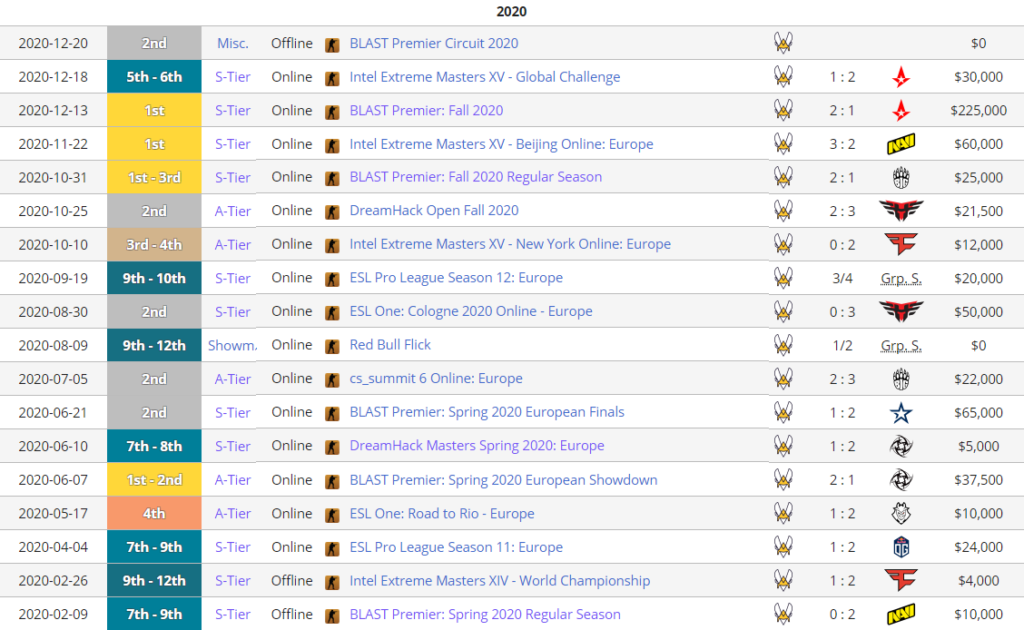 s1mple geçen seneyi Natus Vincere’de geçirdi ve IEM Katowice 2020’de 1.’lik, ICE Challenge 2020’de ise 2.’lik kazandı. Ayriyeten 2 tanede MVP ödülü kazanarak seneyi kapattı.