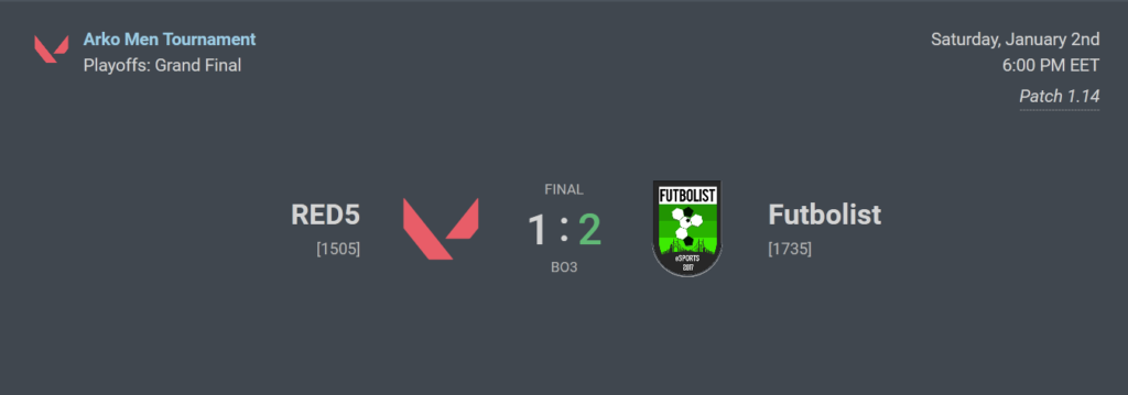 Saat 19.00’da RED5 ile karşılaşan Futbolist, Haven haritasında 13-8 kazandı. RED5 ekibi Split haritasında ise 13-9 ile karşılık verdi. Son karşılaşmada ise uzatmalara giderek 14-12 kazanan Futbolist, Arko Men Valorant turnuvası şampiyonu ve 15.000 TL’lik büyük ödülün sahibi oldu.