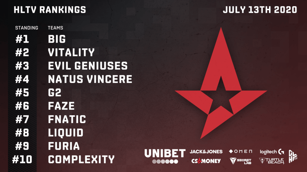 Danimarkalı takım Astralis, 2020 yılına çok kötü bir şekilde başladı. Takım, ana oyuncuları olan Andreas “Xyp9x” Højslethve ve takım kaptanı Lukas “gla1ve” Rossander‘ın takımdan geçici süreliğine ayrılmasından sonra büyük performans kayıpları yaşadı. Takım iki oyuncusunu kaybetmesinden sonra, İki Danimarkalı oyuncuyu bünyesine kattı, bu oyuncular; Patrick “est3ag” Hansen ve Jakob “JuGI” Hansen olmuştu. Ancak bu yapılan değişiklik Astralis ekibinin alehine oldu. Sık sık değişen ve bir türlü oturtulamayan takım anlayışı yüzünden Astralis ekibi yapılan son güncelleme ile birlikte 11. sıraya düşerek yerini Amerikan takım Complexity‘e kaptırmış oldu.