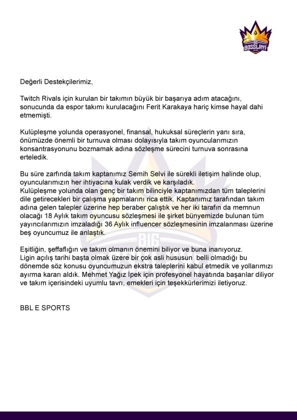 Dün ise takımdan ayrıldığı açıklamıştı. Herkes şaşırtan olay sonrası BBL Esports tarafı sessiz kalmıştı. Bugün BBL Esports’dan ilk açıklama geldi;