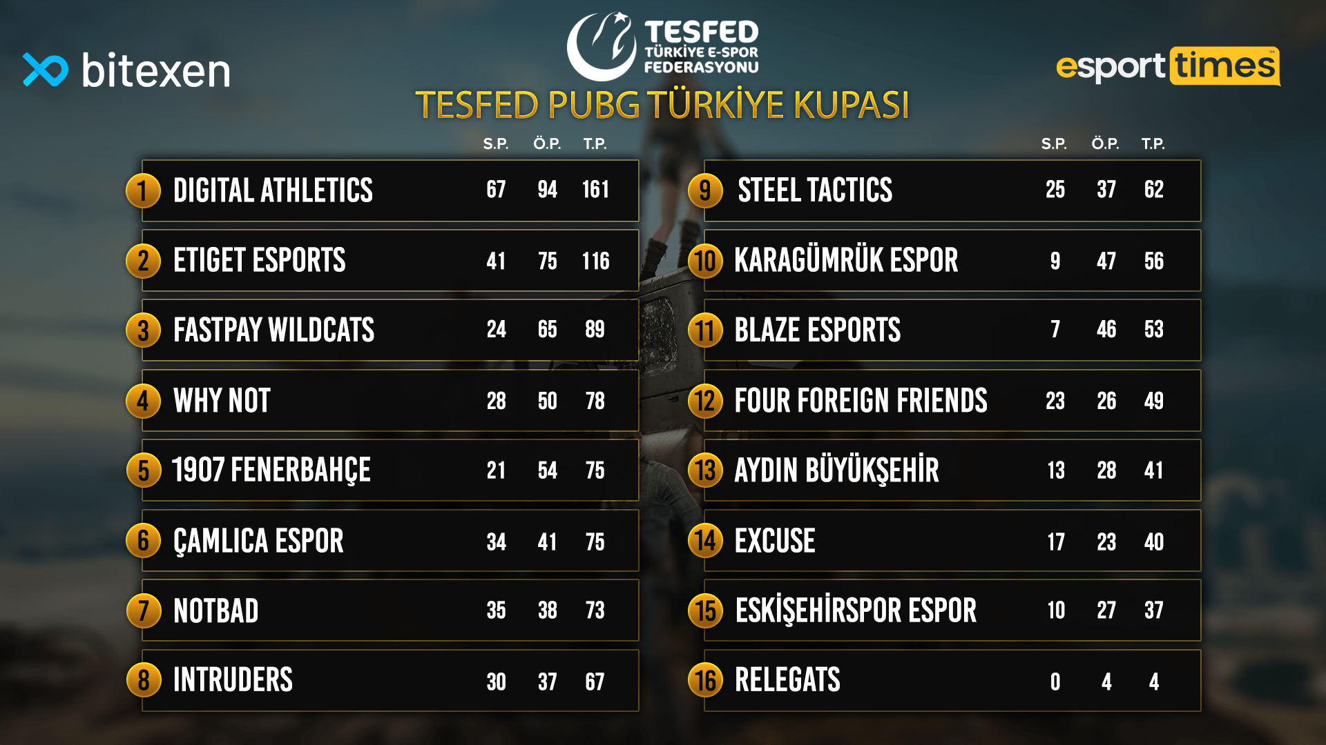 TESFED PUBG Kupası’nın genel sıralaması şu şekilde:
