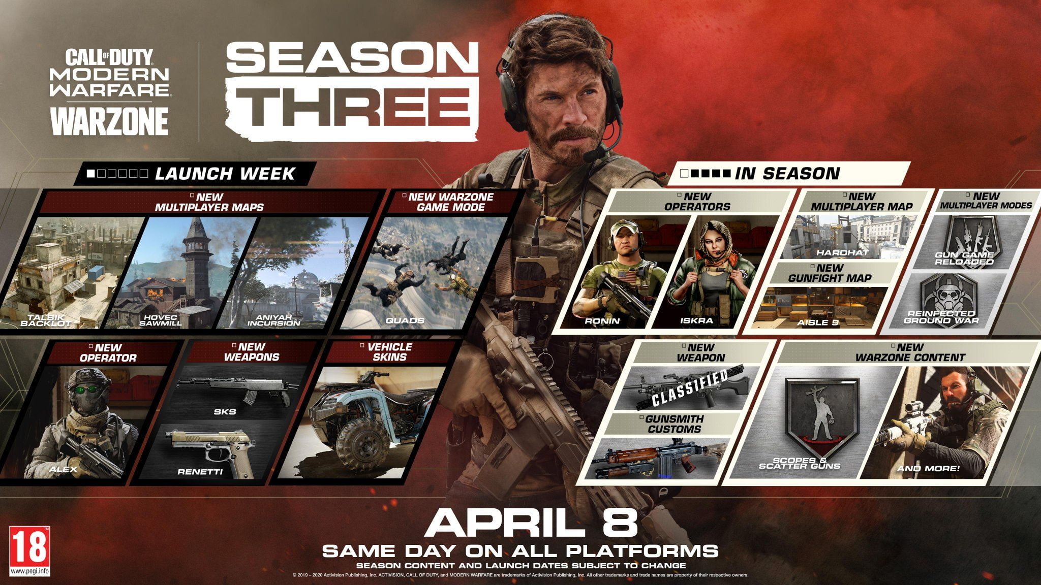 Bu sezonda yeni haritalar, yeni operatörler, yeni silah skinleri yeni oyun modları ve sezon 3 battle pass güncellemelerinden kaynaklı hem multi player hem de battle royale oyuncularını heyecanlandırıcak olan bir sezon bekleniyor.