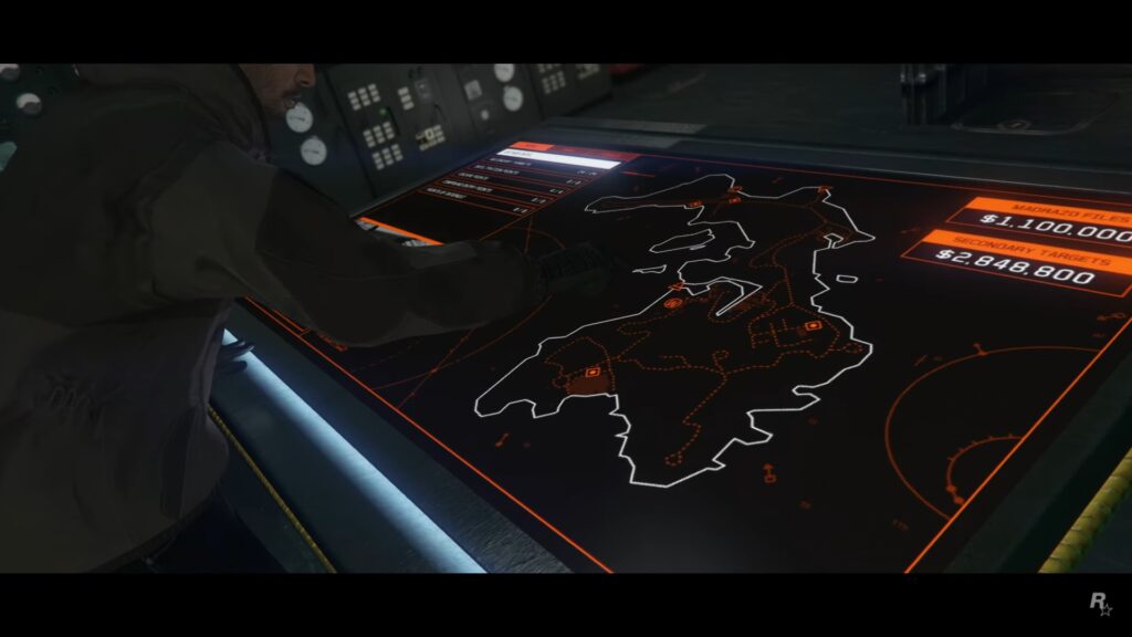 Bir başka sahnede de DLC ile gelmesi muhtemel bir karakter, soygun için bir denizaltına ihtiyaç duyacağımızı söylüyor. Bu denizaltının merkez üssü veya karargah gibi kullanacağımız aşikar. Denizaltının içerisi ise oldukça teknolojik ve çekici duruyor. Ayrıca çeşitli askeri ekipmanların da denizaltının bir parçası olduğu görülüyor. Bunların yanı sıra denizaltı içerisinde yer alan bir monitör üzerinden adanın haritası da görülebiliyor.
