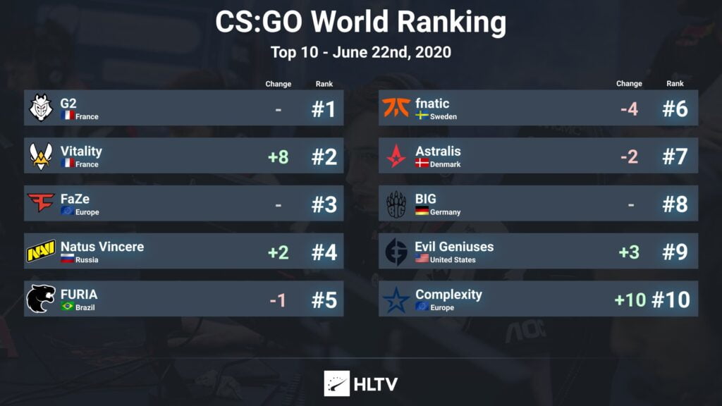 Diğer yandan sıralamalarda Nisan ayından beri yakaladığı ivme ile birincilik koltuğu G2 takımının oldu. Haziran ayında güzel galibiyetler alan Vitality takımı ise sekiz basamak atlayarak ikincilik sırasına yükseldi ve üçüncü sırayı da FaZe takımı adı. Furia, Fnatic, Astralis gibi takımlar düşüş, yaşarken temsilcimiz İsmailcan “XANTARES” Dörtkardeş‘in bulunduğu BIG takımı çok önemli galibiyetler ve DreamHack‘i kazanarak 15 Haziran’da tam tamına on altı basamak atlayarak sekizinci sıraya yükseldi ve yerini korudu. Diğer temsilcimiz Özgür “woxic” Eker‘in bulunduğu takım mousesports aldığı mağlubiyetler ile on ikinci sıraya düşmüş oldu. Tablo şöyle;