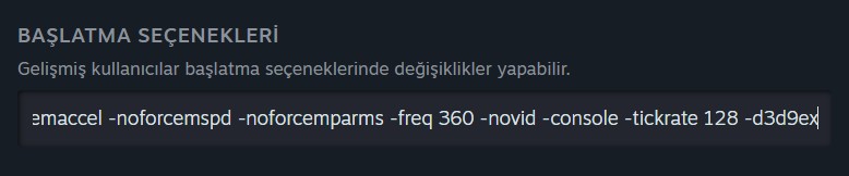 -noforcemaccel -noforcemspd -noforcemparms -freq 360 -novid -console -tickrate 128 -d3d9ex
