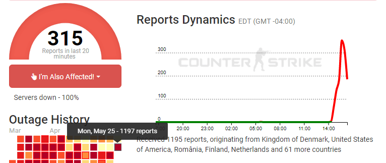 Sonuç olarak, birçok Steam sunucusu ve oyun sunucusu şu anda çökmüş durumda ve CS:GO sunucuları da dahil. Raporlar, 60’tan fazla ülkede bulunan CS:GO sunucuları hakkında binden fazla rapor gösteriyor.