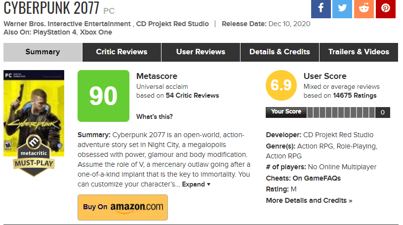 Cyberpunk 2077: Metacritic PC Kullanıcı Puanları
