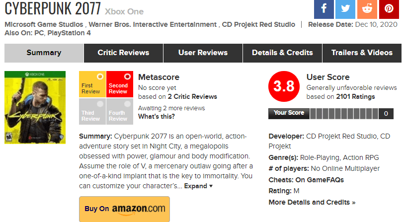 Oyuna erken erişim sağlayan ve inceleme şansı bulan yayıncılar ve kuruluşlardan tam puan alan Cyberpunk 2077 için PC tarafında şuan her şey yolunda gibi gözüküyor. Çok büyük göze batan bir sıkıntının olmadığı PC tarafında, oyuncu şikayetleri de çok düşük seviyelerde. Fakat konsol tarafına yani PS4 ve Xbox One tarafına baktığımızda; konsol oyuncularının hiçte memnun olmadığını söyleyebiliriz. Bu durum Metacritic kullanıcı puanlarına da oldukça yansımış durumda. Oyunun konsol puanları şuan gerçekten çoğu oyundan daha kötü durumda.