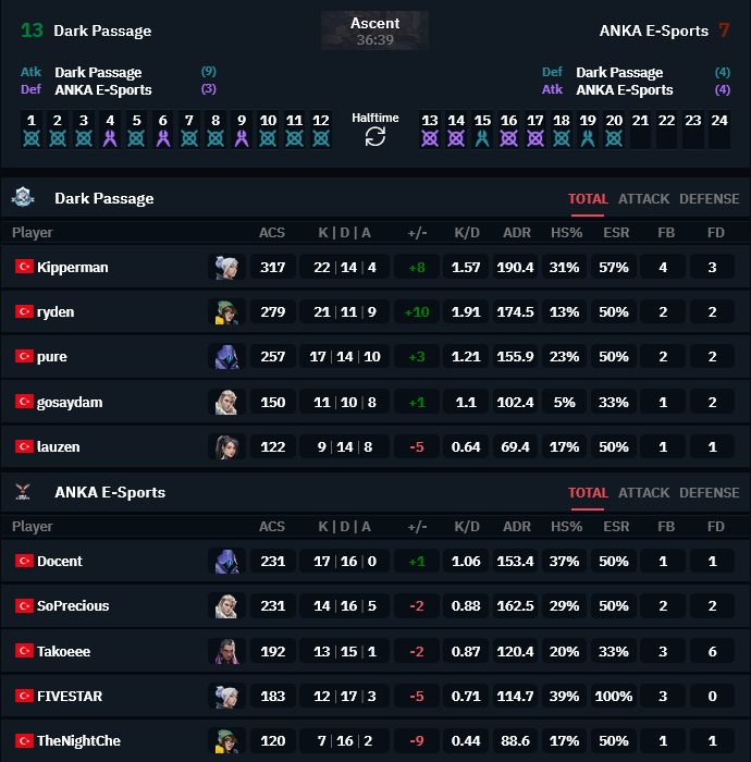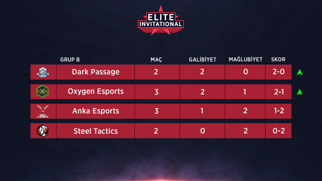 Elite Invitational Valorant B Grubu’nun ilk maçında Dark Passage ve Anka E-sports karşı karşıya geldi. Dark Passage Ascent haritasında rakibine karşı 13-7 skoruyla kazanmayı başardı. Anka E-sports ise Kaybedenler Grubu’na düştü.