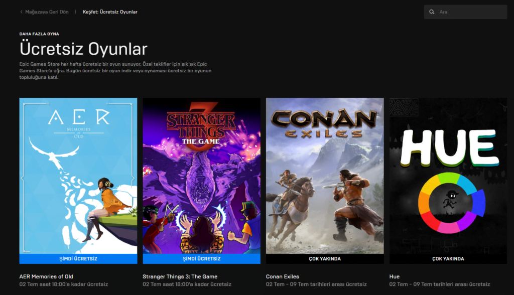 2 Temmuz saat 18.00‘a kadar AER Memories of Old ve Stranger Things 3: The Game oyunlarını tamamen ücretsiz bir şekilde kütüphanenize ekleyebilirsiniz. Ayrıca 2 Temmuz’dan itibaren 1 hafta süre ile verilecek diğer iki oyun ücretsiz oyun ise Conan Exilex ve Hue olacak.