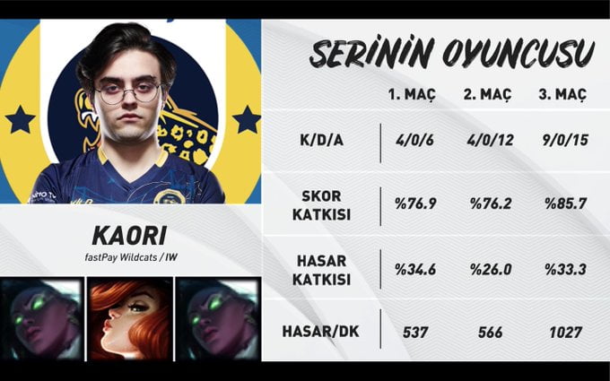 Serinin oyuncusunu seçmek hiç bu kadar zor olmamıştı. IW Kaori, Senna 9/0/14’lük performansı ile öne çıkan isim olsa da takım olarak mükemmele yakın oynayan IW tarafı büyük bir övgüyü hak ediyor ve VFŞL Kış Mevsimi Finali’nde FB’nin rakibi olmayı başarıyor.