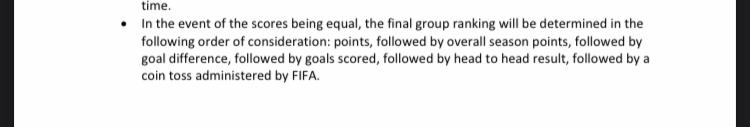 Puanların eşit olması durumunda son grup sıralaması aşağıdaki değerlendirme sırası ile belirlenecek: puanlar, ardından genel sezon puanları, ardından gol farkı, ardından atılan goller, ardından maç sonucu, ardından FIFA tarafından yapılan yazı-tura sonucu.