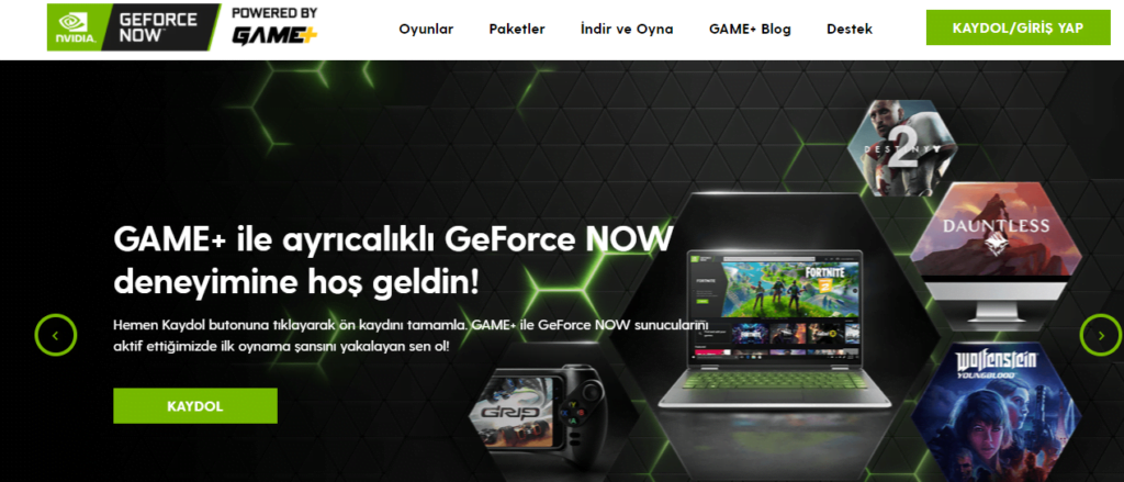 GeForce Now’a kayıt olmak gerçekten çok basit. Öncelikle buradaki linke tıklayarak Game+ GeForce Now resmi sayfasına gidiyoruz. Game+ ana sayfasına gittikten sonra karşımıza direkt olarak “yeşil” renkli kaydol butonu çıkıyor, o butona tıklıyoruz. Kaydol butonuna tıkladıktan sonra yine karşımıza yeşil renkte “Hızlı Giriş İle Kaydol/ Giriş Yap” butonu çıkıyor yine bu butona tıklıyoruz. Bu butona tıkladıktan sonra eğer “hızlı giriş” hesabınız varsa giriş yapabilir yoksa da ekranda bulunan “Üye Ol” seçeneğine tıklayarak yeni üyelik oluşturabilirsiniz.