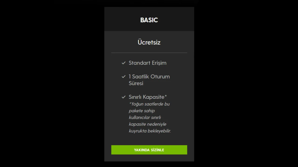 Diğer bir üyelik seçeneği olan Basic üyelik seçeneği ise elbette Premium üyelikten daha az özellik sunuyor. Basic üyelikte Premiumdan farklı olarak eğer platformda yoğunluk varsa sıra beklemek zorundasınız. İkinci farklılık ise oturum süresinde mevcut. Oturum süreniz yalnızca 1 saat ile sınırlı. Üçüncü farklılık ise Basic üyelik sahipleri oyunlarda RTX özelliğini kullanamayacaklar.
