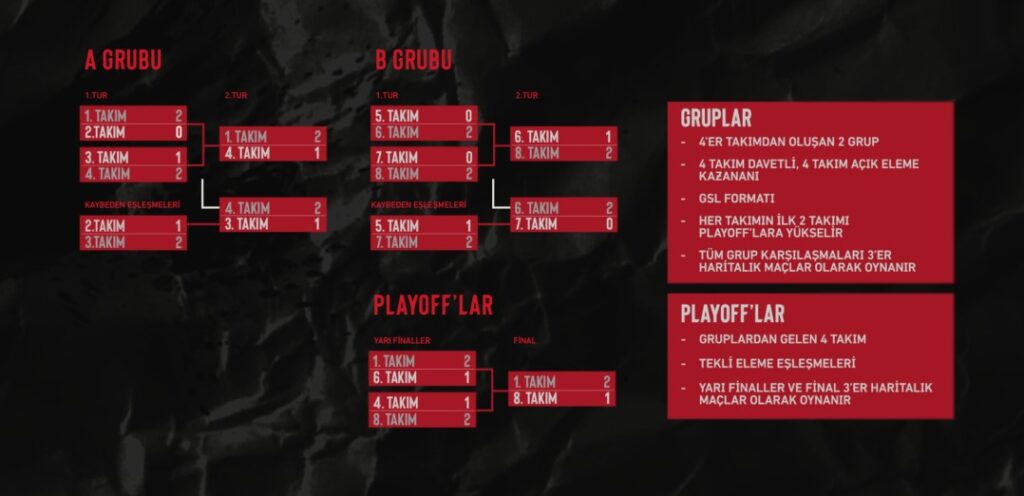 Bildiğiniz üzere dörder kişilik iki grupta görseldeki gibi bir mücadele gerçekleşmişti. Bo3 formatındaki 2 tur şeklinde gerçekleşen mücadeleler sonunda her gruptan iki takım yükseldi. Bu takımlar A grubundan Thunerbolts Gaming ve Sahangiller Gaming oldu. B grubundan ise Real Winner Company ve Eternal Fire bu şansı yakaladı.