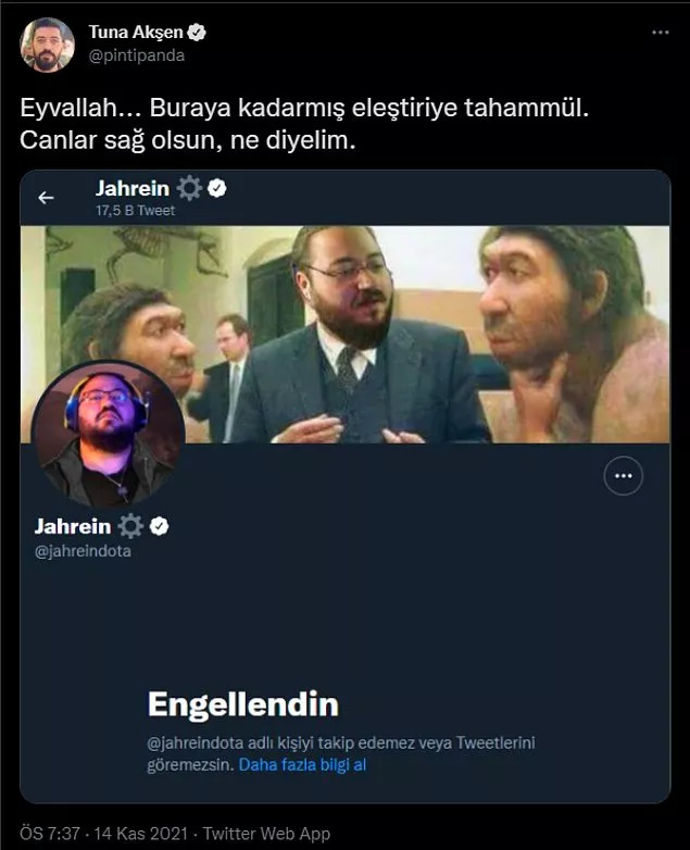 Ardından saat 19:37’de PintiPanda, Jahrein’in kendisini Twitter üzerinden engellediğini açıklayan bir fotoğraf paylaştı ve açıklamada bulundu.