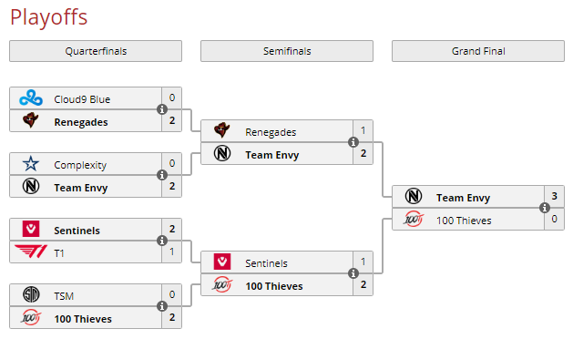 Yarı finallerde Renegades ile Team Envy eşleşti. Diğer yarı final eşleşmesi de Sentinels ve 100 Thieves arasında oldu.