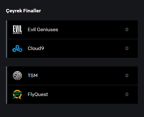 LCS’de normal sezonu 17G-1M ile bitiren ve şüphesiz en büyük şampiyonluk adayı olan Cloud9, 1. turda 100 Thieves karşısında 3-0 gibi rahat bir skorla adını çeyrek finale yazdırdı. Ligi 2. sırada bitiren Evil Geniuses, 1. turda yakın takipçisi FlyQuest‘i 3-1 ile geçip adını çeyrek finale yazdıran diğer ekipti.