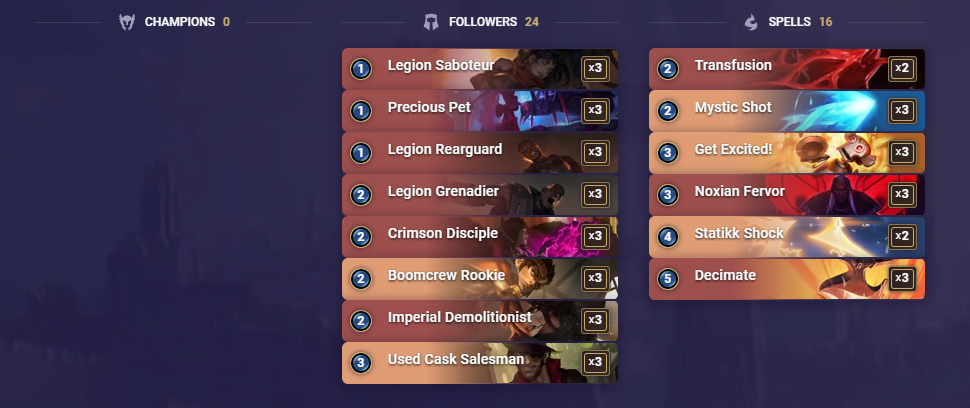 Şampiyon istemeyen bu deste, ucuz olması, anlama ve kontrol etme kolaylığı ve kazanma oranı yüksekliği ile şu anda kullanan oyuncuların favorisi. Tamamen hasar ve hasar ve hasara odaklanan bu destede eğer ki oyun ortaya geçmeden bitiremezseniz kendinizi çıkılamayacak bir durumda bulabilirsiniz.