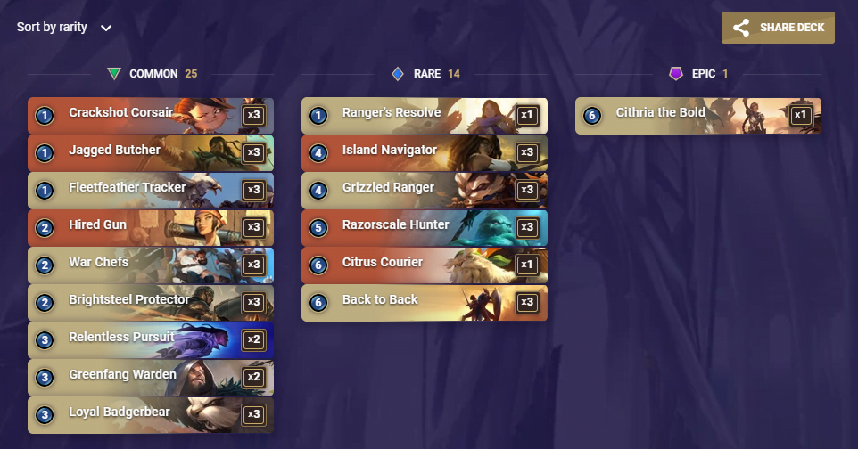 Normalde 3 tane Quinn ve Miss Fortune ile oynanan bu agresif desteyi şampiyonsuz da oynayabilirsiniz. Ve bu versiyonun en iyi yanı 10.000 kristal bile istemiyor! Öncülerin her tur çifte saldırısı ile oyunu hızlıca kapatmaya bakan bu deste güçlü vuruşunun yanında rakibinin zayıf olduğu turlarda Amansız Takip ile yüksek hasar çıkararak oyunu kapatıyor.