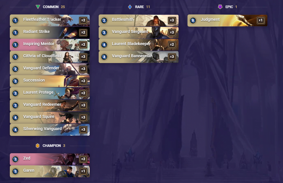 Bu 16.000 kristallik deste ile rakibinizin oynama isteğini yok edebilirsiniz. Erkenden Lejyon Sabotajcısı ve Yeşilkırlı İkili ile vuracağınız hasarın yanına Zed ve Hiddet Karşımı gelince uzun oyunlarda yetenek isteyen ama kısa oyunları domine edebileceğiniz bir deste bu. Elinizde Yadsıma için yeterince mana tutmaya dikkat edin ki büyük büyüler tahtanızı temizlemesin.