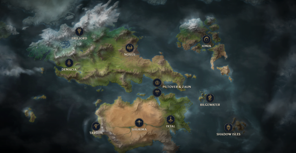 Bunlardan Freljord, Demacia, Noxus, Piltover ve Zaun, İonia, Gölge Adalar ve en yeni gelen Bilgewater da dahil olmak üzere yedi tanesi şu anda oyunda oynanabilir halda mevcut. Bu bize yeni gelen bölge için Bandle Şehri, Hiçlik, Ixtal, Shurima veya Targon Dağı olma ihtimalini bırakıyor.