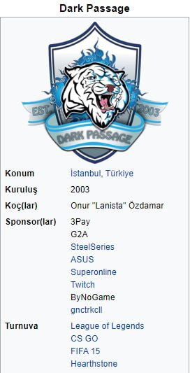 Dark Passage, 2003 yılında kurulan espor kulübüdür. League of Legends dışında FIFA, CS: GO ve Hearthstone takımları da mevcuttur. Ayrıca kadın League of Legends takımı da mevcuttur. Takım, halihazırda VFŞL Şampiyonluk Ligi’nde mücadele etmektedir.