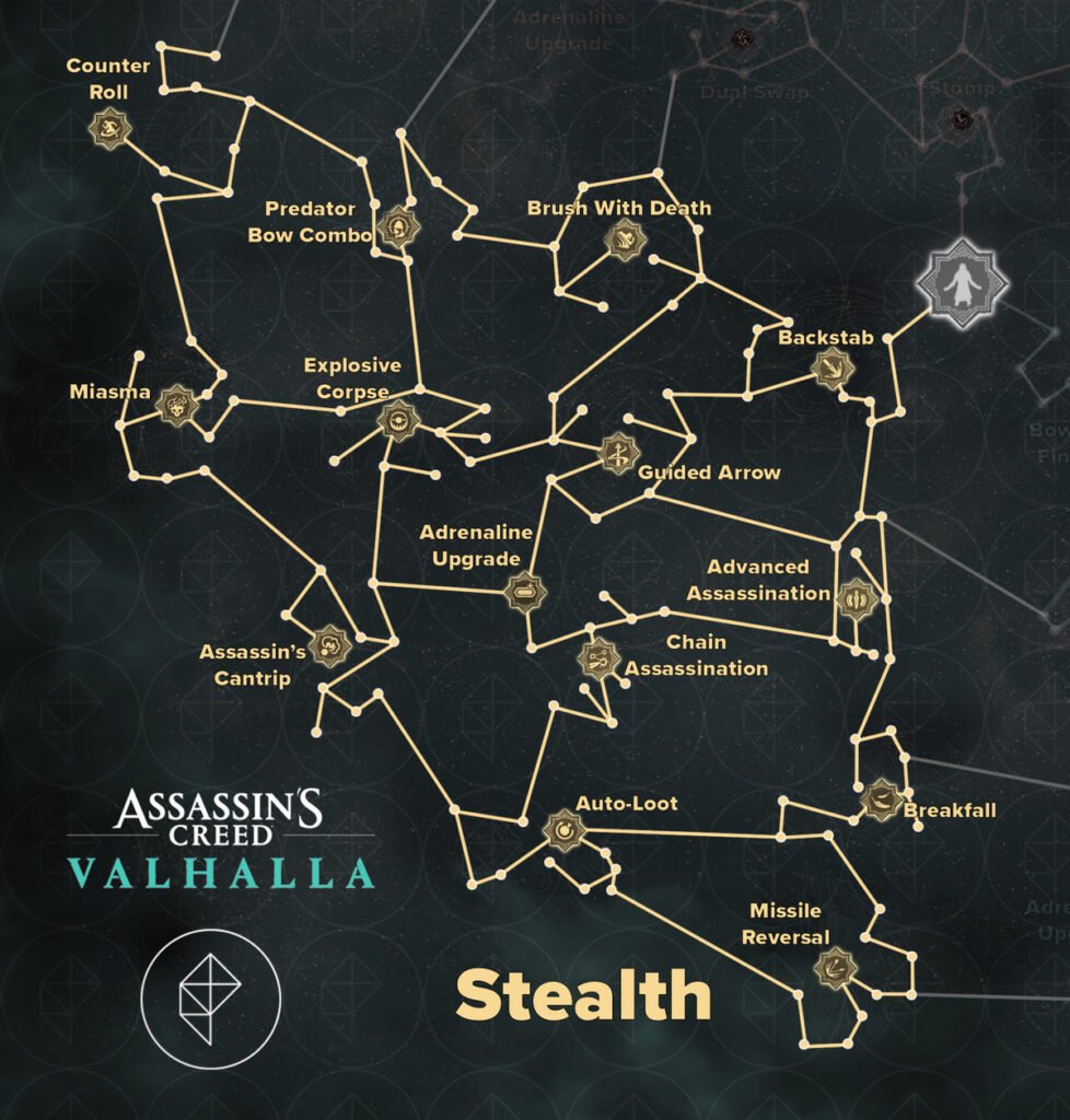 Takımyıldızlarının her birine girerken, bir grup büyük yetenek seçenekleri ve bir grup da küçük yetenek seçenekleri göreceksiniz. Bunlar Eivor’un dövüş becerilerini, zehir gibi durumlara karşı artan direncinin yanı sıra sağlık, gizlilik, menzilli saldırılar için güçlendirmelerle, geliştirmeye yardımcı olur. Gücünüzü yükselttikçe bu çeşitli yetenek güçlendirmelerine sahip olacaksınız, ancak bunlar çok da önemli değildir. Buradaki önemli yetenekler, Assassin’s Creed Valhalla’nın ana beceriler için verdiği yüksek avantajlardır.