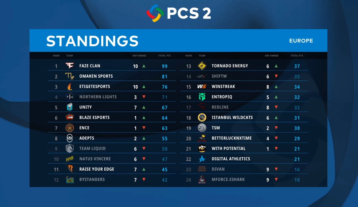 B ve C grupları arasında oynanan 6 maç sonunda Faze Clan ekibi genel puan durumunda 99 puan ile zirveye yerleşirken, Omaken Sports 2. sıradaki yerini korudu. 2. gün maçlarında iyi bir performans sergileyen temsilcimiz Etiget Esports 59 puan toplayarak puanını 76’ya yükseltti ve sıralamada 3.’lüğe yükseldi. Diğer temsilcilerimizden Blaze Esports 27 puan toplayıp puanını 64’e yükseltirken, İstanbul WildCats 31 puan topladı son olarak Digital Athletics ise beklenen performansı sergileyemeyerek sadece 21 puan toplayabildi. İşte 2. günün ardından puan durumu: