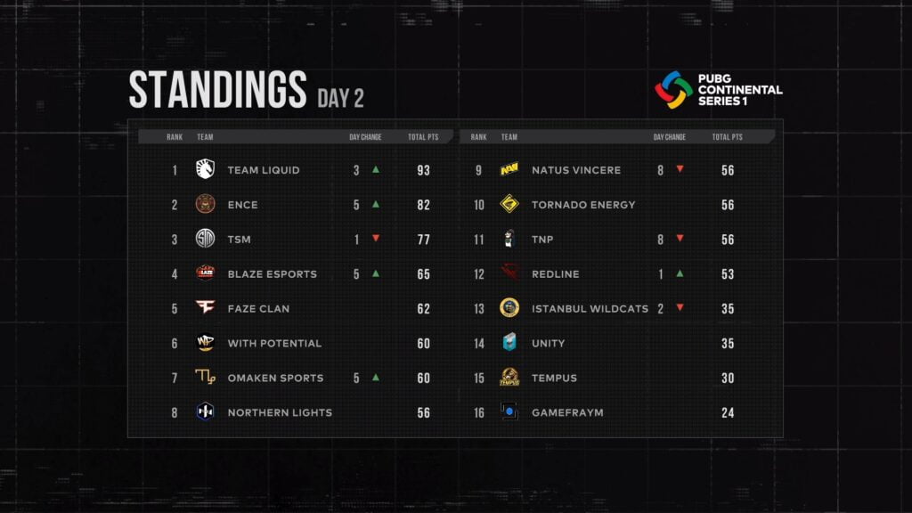 PCS1 EUROPE GRAND FINAL‘i, Team Liquid 62 kill ile 93 puan alarak 1. sırada tamamlarken, 2. ENCE 45 kill ile 82 puan, TSM 49 kill 77 puan ile 3. oldu. PCS 1 Avrupa Büyük Finalleri’nin genel puan durumu şu şekilde;