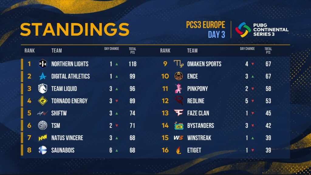 Günün son karşılaşmasında ise temsilcimiz Digital Athletics 8. sırada tamamlarken, diğer temsilcimiz Etiget Esports ise 10. sırada yer aldı. Böylelikle PCS3 Avrupa Büyük Final‘in 2. haftasında temsilcimiz Digital Athletics 99 puan ile 2. sırada tamamlerken, diğer temsilcimiz Etiget Esports 27 puan ile 16. sırada tamamladı.