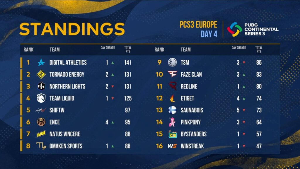 PUBG Corporation tarafından düzenlenen Continental Serisinin üçüncüsü olan PCS3 Avrupa Büyük Finali‘nin 2. haftasında temsilcimiz Digital Athletics liderliği ele geçirdi. 141 puan ile lider olan temsilcimiz DA, turnuvanın 4. gününü lider olarak tamamladı.