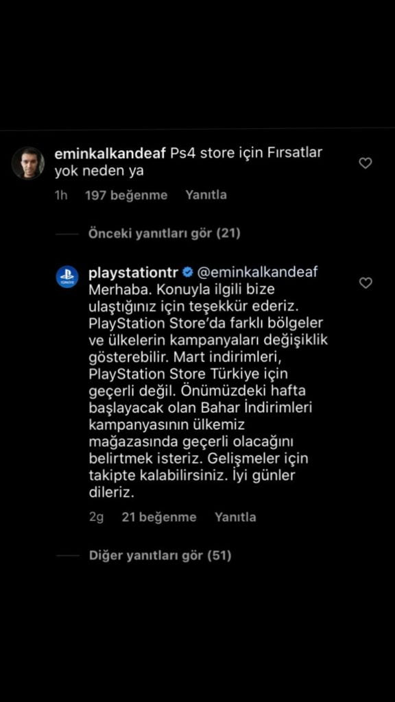 “PlayStation Store’da farklı bölgeler ve ülkelerin kampanyaları değişiklik gösterebilir. Mart indirimleri PlayStation Store Türkiye için geçerli değil. Önümüzdeki hafta başlayacak olan Bahar indirimleri kampanyasının ülkemiz mağazasında geçerli olacağını belirtmek isteriz.”