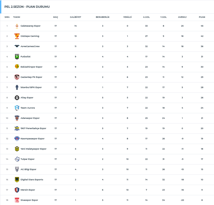 Galatasaray, Göztepe, Başakşehir, Fenerbahçe, Sivasspor gibi büyük lig takımlarının espor takımlarından oluşan Pro Elite League 17. Hafta maçlarının bitimi ile ilk devreyi kapattı. İlk yarıyı 45 puanla Galatasaray Espor lider bitirirken ezeli rakibi 1907 Fenerbahçe Espor ise 11. sırada yer aldı. PEL 2. Sezon’un ilk yarısının puan durumunu aşağıdaki görselden inceleyebilirsiniz.