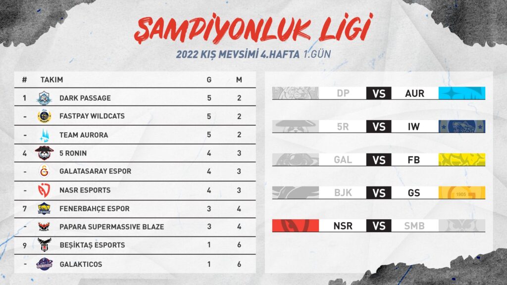 Bugün oynanan Fenerbahçe Esports vs. Galakticos arasında olan mücadelede Fenerbahçe Esports karşılaşmadan galip ayrıldı. Böylece Galakticos Mevsim Finalleri umutlarını yitirmeye başladı. Ayrıca Beşiktaş Esports’ta ligin dibine demir attı. Hem Galakticos hem de Beşiktaş Esports‘un ligde sadece 1 galibiyeti var. Kış Mevsimi 4. hafta ilk gün karşılaşmalarının ardından takımlar yarınki karşılaşmalara odaklanmış durumda gözüküyor.