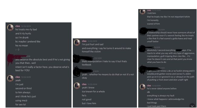 Cleo Hernandez, olayın cinselliğin yanı sıra ayrıca psikolojik baskı, mobing, manipülasyon olduğunu da ekledi. Sinatraa’nın eski kız arkadaşı Cleoh Hernandez ayrıca ilişkilerinin sadece dokuz ay sürdüğünü söyledi. Ek olarak bu süre zarfında sürekli korku içinde yaşadığını da belirtti. Cleo Hernandez mesajlarını ve Sentinals ile yapılan bir konuşmanın kaydının da elinde olduğunu ifade etti. Kanıt niteliği taşıyan bu belgeleri istenildiği zaman gerekli yerlere sunabileceğini belirtti. Cle0h Hernandez, her şeyi ifşa ettiğinde, kanıtlarının 15 sayfadan daha uzun olacağını da sözlerine ekledi. Profesyonel oyuncu Sinatraa bu iddialara henüz yanıt vermedi.