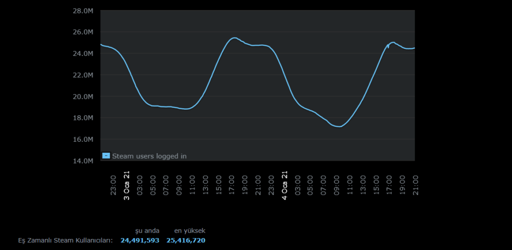 SteamDB’den elde ettiğimiz verilere göre Steam, yeni rekorunu 2 Ocak 2021 tarihinde 25.415.080 eş zamanlı oyuncu ile kırdı. Steam bu oyuncu sayısı ile ilk defa 25 milyon eş zamanlı oyuncu sayısının üzerine çıktı. Çok süre geçmeden Steam bu rekoru 25.418.674 eş zamanlı oyuncu sayısı ile bir kez daha kırdı. Fakat şunu söylemek gerekiyor ki bu 25 milyon olarak bahsettiğimiz eş zamanlı oyuncu sayısı, aktif olarak oyun oynayan oyuncu sayısı değil. Bu 25 milyon sayısı aslında Steam’de çevrim içi olan oyuncuların sayısı. Rekorun kırıldığı sırada aktif olarak oyun oynayan oyuncuların sayısı ise 7.2 milyon olarak açıklandı. Fakat aktif oyuncu sayısının Mart ayındaki verilere göre biraz azaldığını söyleyebiliriz.