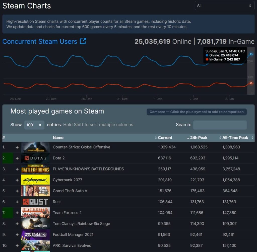 Dünyanın en büyük dijital oyun platformu olan Steam için 2021 senesi de 2020 senesinde olduğu gibi rekorlar yılı olacakmış gibi duruyor. En son 12 Aralık tarihinde 24 milyon 700 bin eş zamanlı oyuncu sayısıyla kırdığı rekoru, bir kez daha 2021 yılının hemen başında 25 milyon eş zamanlı oyuncu sayısıyla kırdı.
