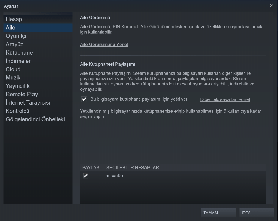 Bu menüye ulaşabilmeniz için öncelikle Steam > Ayarlar > Aile bölümüne gelmeniz gerekmektedir. Bu kısımda işaretli olan bölümleri sizin de işaretlemeniz gerekiyor. Daha sonra ise Diğer bilgisayarları yönet seçeneğine tıklayarak hesabınızı paylaşmak istediğiniz arkadaşlarınızı veya kullandığınız farklı bir hesap varsa bunu eklemeniz gerekiyor.