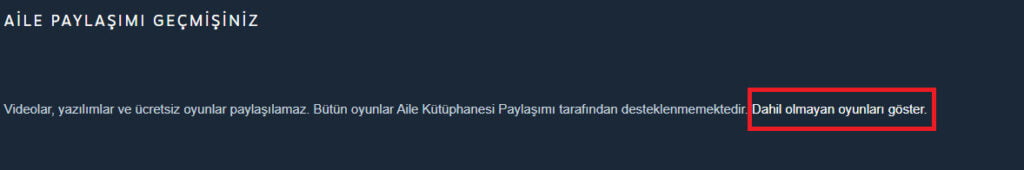 Açılan sayfanın aşağı kısmında bulunan Aile Paylaşımı Geçmişiniz bölümünden belirtmiş olduğum kutucuğa tıklayarak aile paylaşımında kullanamayacağınız oyunların listesini görebilirsiniz.