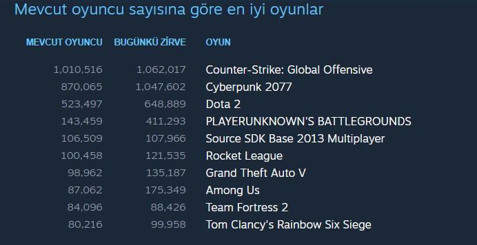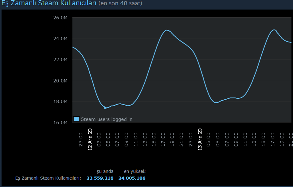 Steam veri tabanı verilerine göre; Steam,12 Aralık tarihinde 24 saat içerisinde 24 milyon 776 bin 635 eş zamanlı oyuncu sayısına ulaşarak kendi sahip olduğu tüm zamanlardaki eş zamanlı oyuncu sayısı rekorunu kırdı. Steam’in bu başarısının arkasında; elbette karantina süreçlerinde eve kapanmaların ve kış aylarının da katkısının olduğu yadsınamaz bir gerçek. Bu dönemde oyun oynamayan insanların bile çoğu evde geçirilen sürenin artmasına bağlı olarak; en az bir oyunu oynamaya başladı. Bir diğer öne çıkan faktöründe Cyberpunk 2077’nin çıkışının olduğu söyleniyor. Ön siparişlerde 8 milyon sipariş sayısını geçen Cyberpunk 2077’ye ilgi çok yoğun oldu.