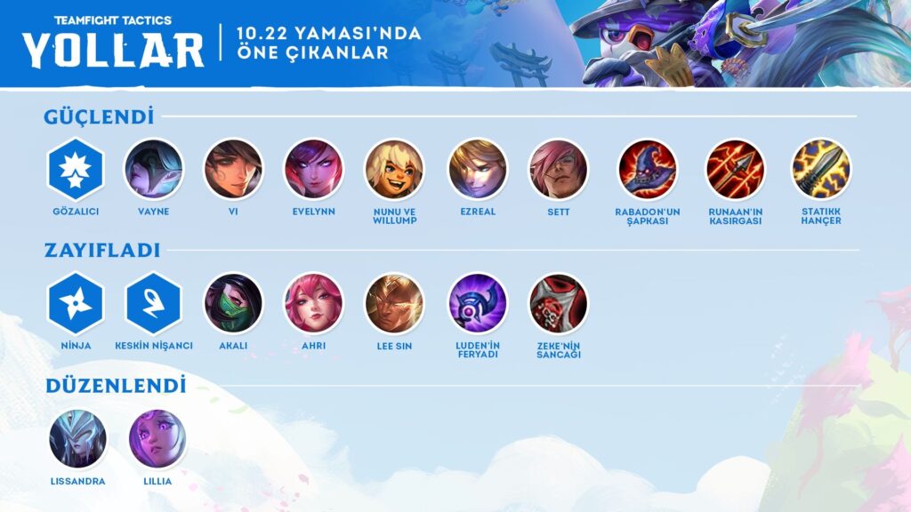 Riot Games’in sevilen oyunu Teamfight Tactics‘in 10.22 güncelleme notları paylaşıldı. Güncellemede göze çarpan değişiklik, daha fazla karşılaştığımız şampiyonları (Lee sin, Akali ve Ahri) gücünü azaltıp diğerlerine nazaran değer görmeyen şampiyonların (Vayne, Vi, Evelynn, Nunu ve Willump, Ezreal ve Sett) güçlendirmek oldu. Lissandra ve Lillia üzerinde de bazı düzenlemeler yapıldı. Şampiyon düzenlemeleri dışında bazı eşyalar da güçlendirildi ya da zayıflatıldı. Güçlendirilen eşyalar, Rabadon’un Şapkası, Runaan’ın Kasırgası ve Statik Hançer; zayıflatılan eşyalar ise Luden’in Feryadı ve Zeke’nin Sancağı oldu.