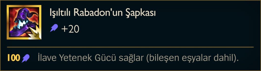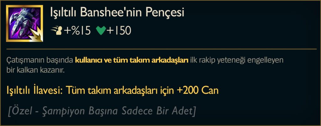- %10 Saldırı hızı: Sahibinin yetenekleri ve saldırıları %10 ilave hasar verir. Hedefin maksimum sağlığı 1100’den fazlaysa, bonus %75’e çıkar.