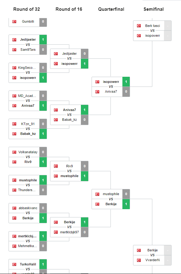 Türkiye’de 1579 oyuncunun katıldığı turnuvada son 4 belli oldu. Göztepe Gaming oyuncusu Berk Taşçı, Futbolist oyuncusu İsopowerr, İstanbul Wild Cats oyuncusu Berkje, ve Türkiye FIFA sahnesinde yeni gördüğümüz bir isim Mert Tantu yani VvarderN. Oyuncular kendi oluşturdukları kadrolar ile mücadele ettikleri turnuvada 3500 TL’ik 1. lik ödülü Ve 1500 TL’lik 2.lik ödülü için 29.03.2020 günü 16.00’da kozlarını paylaşacaklar.